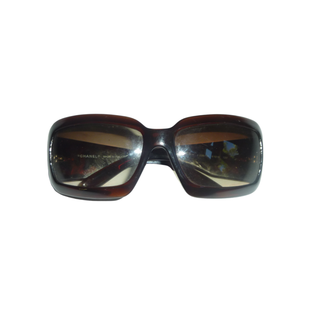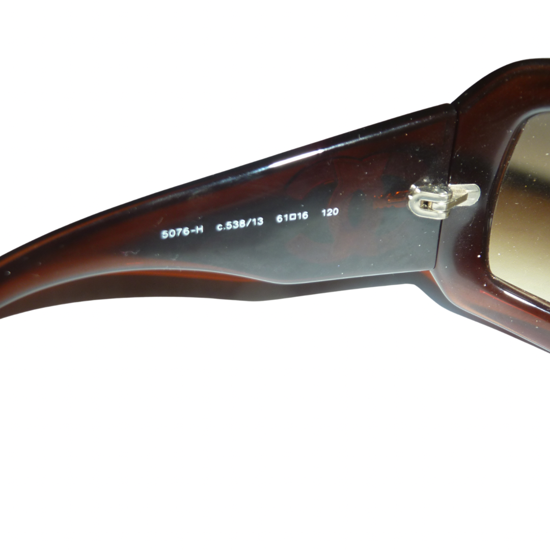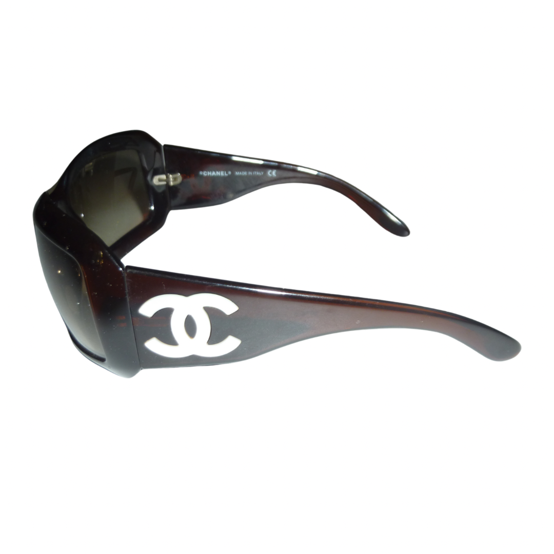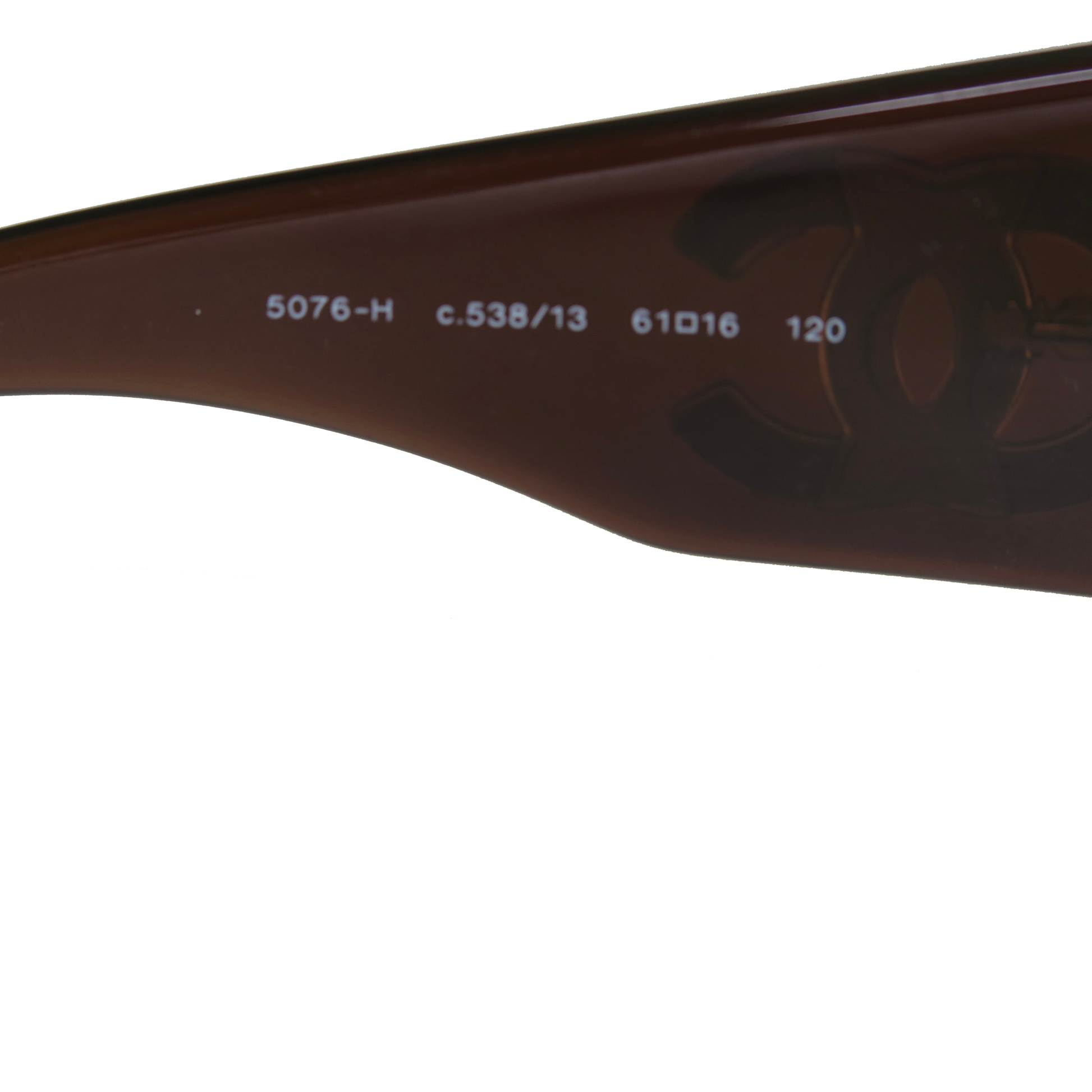Chanel mother of pearl sunglasses with "CC" emblem on arms and shield style lenses. Model: 5076