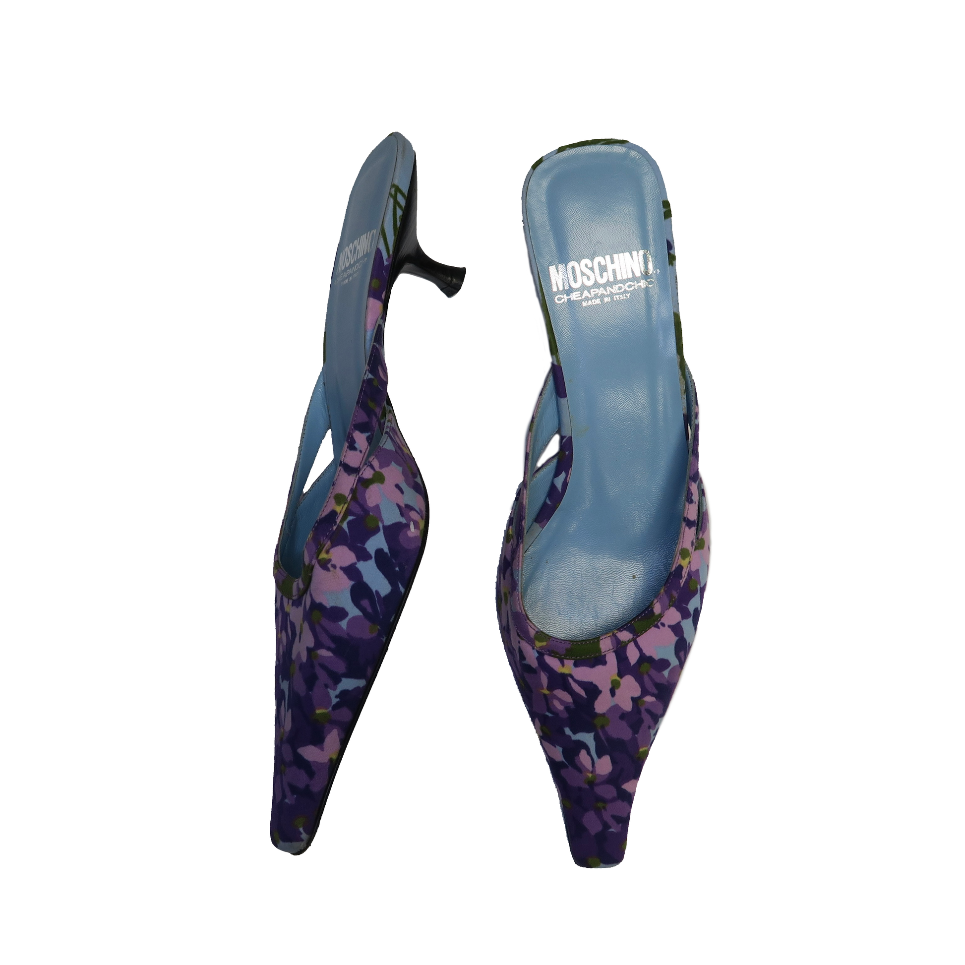 Moschino Cheap & Chic floral mules with small cut-outs at sides and very slight kitten heel. Made of fabric.